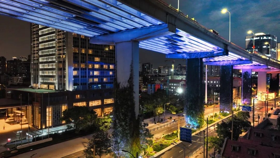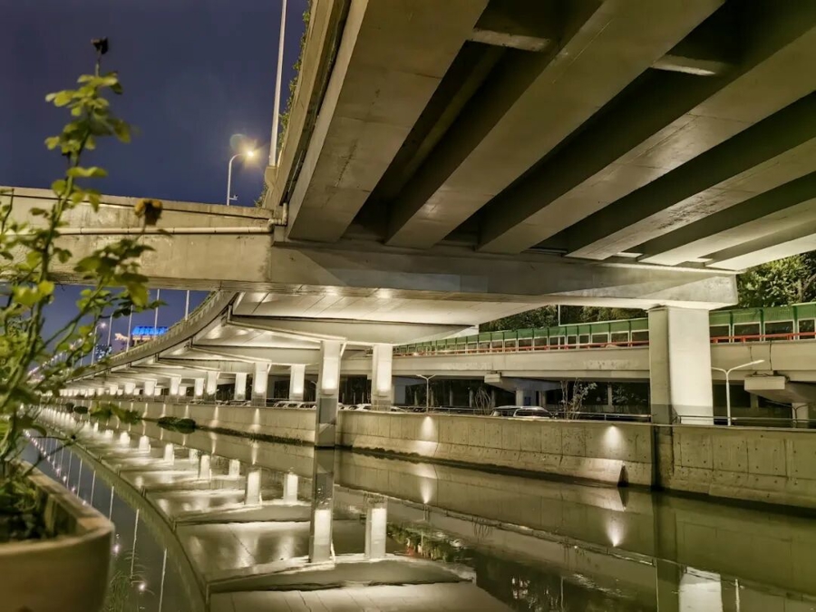 工程创新构建了“高架桥底(绿化带)-高架桥体(桥腹)-桥梁、堤岸”三维立体照明体系,突破了单一平面照明思维,全方位激活高架沿线夜间活力。在二期高架桥底景观绿化带,布置了388套防眩光、低能耗的投光灯,柔和的光线照亮了绿植和通行步道。